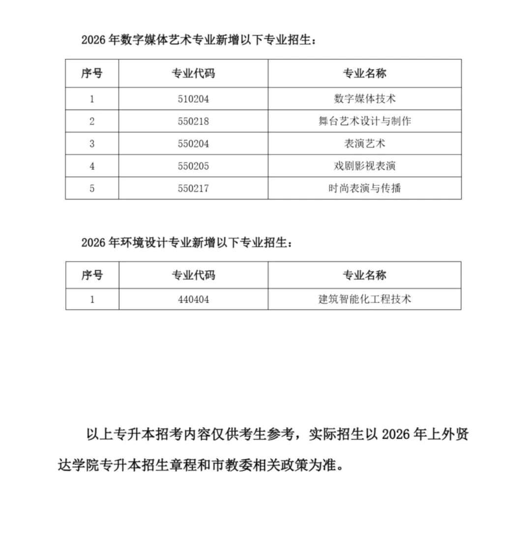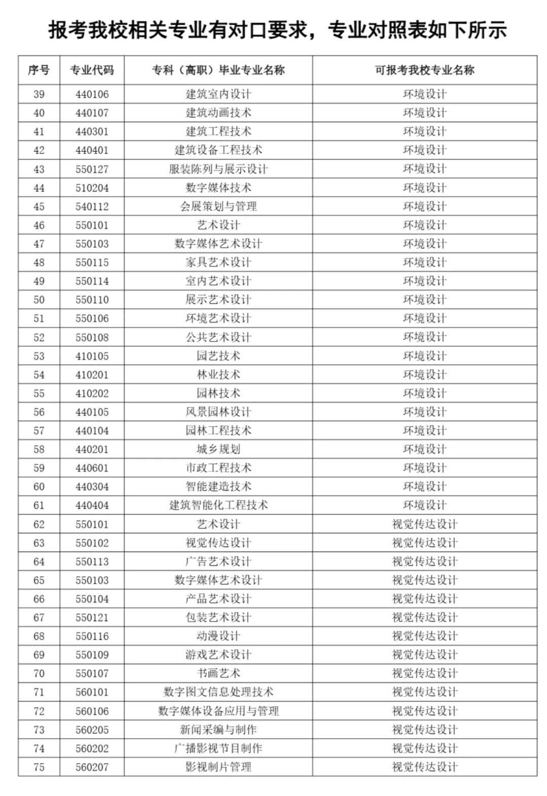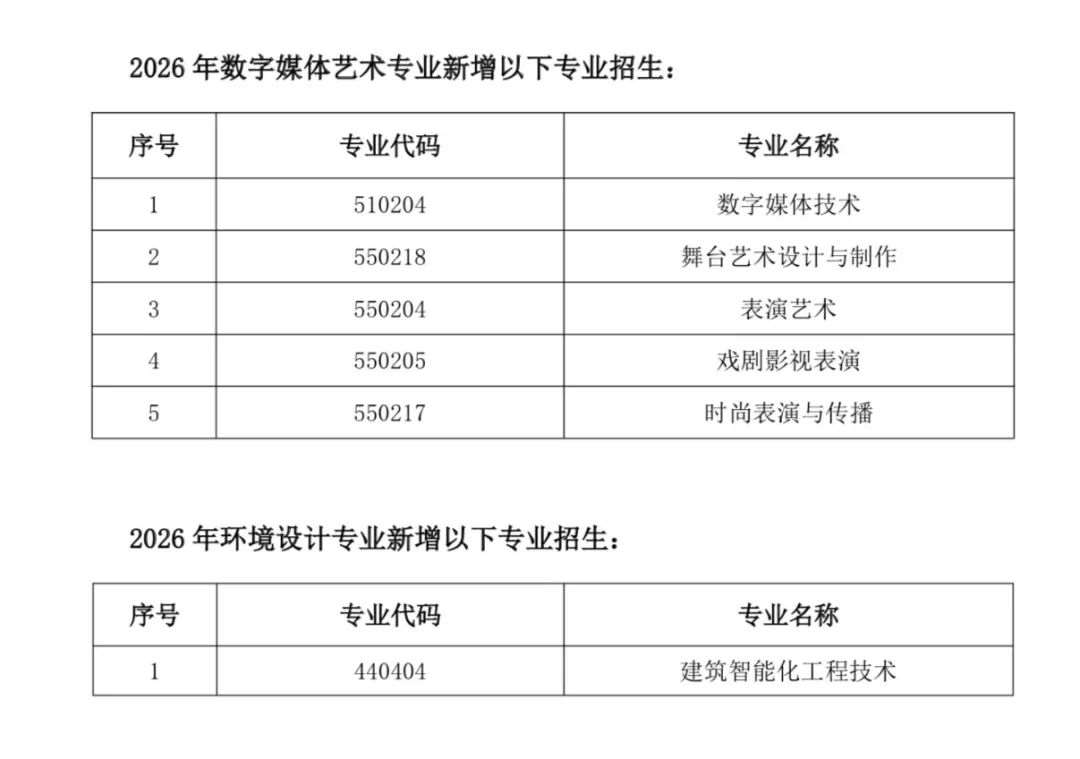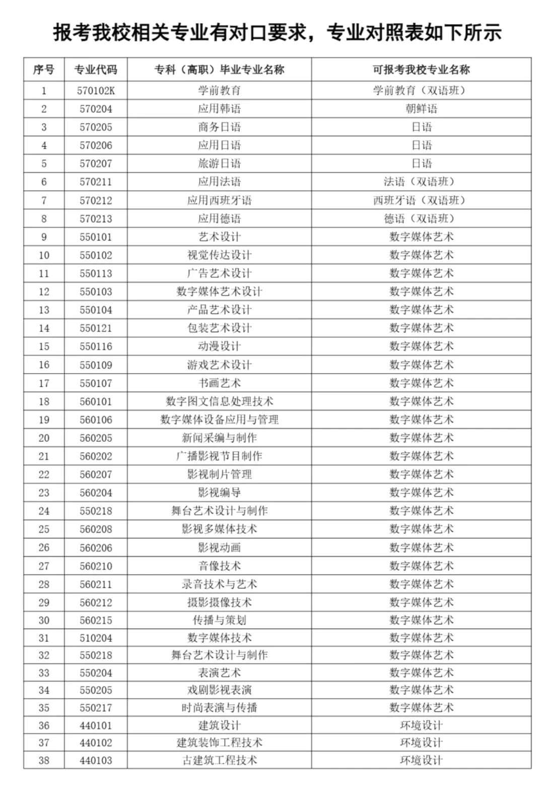 招收专业:550101艺术设计;550102视觉传达设计;550113广告艺术设计;550103数字媒体艺术设计;550104产品艺术设计;550121包装艺术设计;550116动漫设计;550109游戏艺术设计;550107书画艺术;560101数字图文信息处理技术;560106数字媒体设备应用与管理;560205新闻采编与制作;560202广播影视节目制作;560207影视制片管理;560204影视编导;550218舞台艺术设计与制作;560208影视多媒体技术;560206影视动画;560210音像技术;560211录音技术与艺术;560212摄影摄像技术;560215传播与策划;510204数字媒体技术;550218舞台艺术设计与制作;550204表演艺术;550205戏剧影视表演;550217时尚表演与传播;550401文化创意与策划;560213融媒体技术与运营;550123首饰设计与工艺